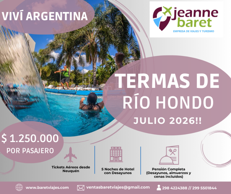 Día 1: Salida en horario convenido desde Aeropuerto Neuquén, con escala en Aeroparque. Arribo a la ciudad de Tucumán. Desde allí nos trasladaremos hasta Termas de Río Hondo. Check In en Hotel Nuevo Río Hondo. Tarde Libre. Cena incluída.-